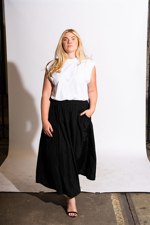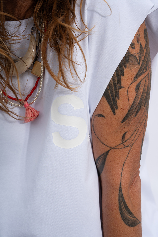 Dropped shoulders Met opgerold mouwtje Mooie zware kwaliteit 230 grams Rinse wassing om een fijne handfeel te krijgen Buitenkant eco pu print Handgeborduurde kraaltjes Loose fit Composition: 100% cotton
